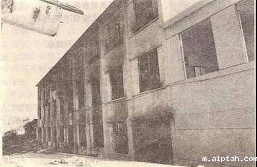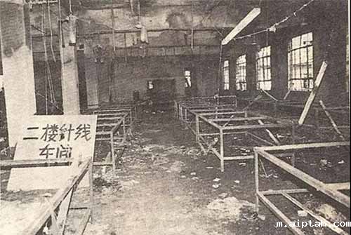 我们从西南出入口进入车间大楼。空旷的开通式厂房内弥漫着一股呛人的气息。厂房里的机器设备被烧得一塌糊涂。成堆的化纤面料,烧成焦炭状板结在地面上。厂房内壁大片脱落,房顶吊扇的铁叶片,被火焰烤化后像面条一样耷拉在半空中。按防火规定,车间必须与仓库分设,但这个车间大楼底层的东部,就是该厂的原料仓库,与同在底层的裁衣车间的分界,仅是一层由铁条和铁网组成的隔离网。