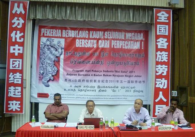五一国际劳动节纪念活动:“全国各族劳动人民,从分化中团结起来” 联办单位:林连玉基金(新山区联委会)、柔佛州被压迫人民联盟(JERIT)、大红花之友(Persahabatan Semparuthi)及柔佛州人民之友工委会 地点:新山宽柔中学杨文富大讲堂 大会接受(1)大会主席讲话《劳动人民团结起来,争取更美好的明天!》与(2)工委吴振宇撰写的《马来西亚“五一委员会”如何纪念“国际劳动节”》的纪念文章,以及最后通过《柔佛州4非政府组织2011年五一国际劳动节大会诉求》。 讲座会由(1)杨培根主讲《马来西亚印族从困境走向觉醒》专题,以及(2)《大红花》(淡米尔文)杂志编辑尤瓦拉詹(Yuvarajan Subramaniam)主讲《雪州园丘工人的房屋问题:我们只要求房子》专题。 |