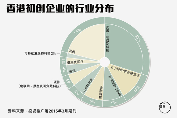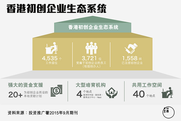 香港政府也在努力推动青年创业,特首梁振英刚在1月13日发表的施政报告中便宣布预留20亿元成立“创科创投基金”,投资本地科技初创企业。根据投资推广署2015年9月公布,现时香港有1558间已注册的初创企业,集中在“资讯、电脑及科技”行业,占初创企业的30%。