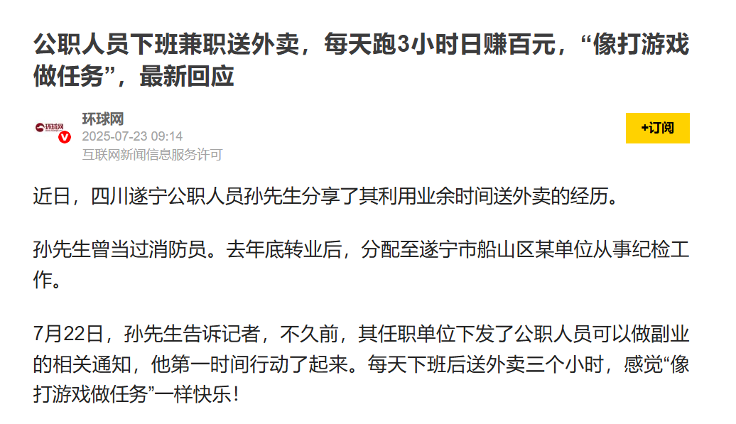 以此谋生的感觉不到快乐,感到快乐的不以此谋生,这宣传思路也是没谁了。 这两天有个新闻上了热搜。 四川遂宁的孙先生,从消防员转业到体制内工作,近日下班后兼职送外卖,日赚100多元。 “感觉像打游戏,接任务、出发、完成任务、得到奖励。” 媒体宣传他觉得很快乐,还反复强调,连快乐后面都是加的都是感叹号。 此事引发关注后,7月23日,遂宁市纪委工作人员回应媒