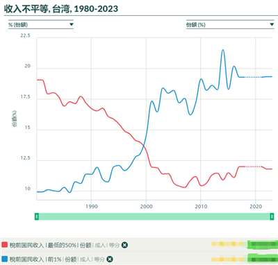 1、占台湾省人口1%最顶级富豪收入(蓝色)与占台湾省人口50%的普通群众(红色)的收入对比。