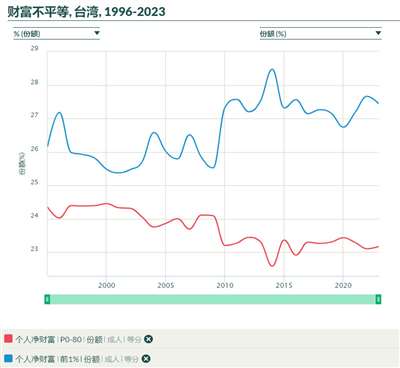2、占台湾省人口1%最顶级富豪财富(蓝色)与占台湾省人口80%的普通群众(红色)的财富对比。