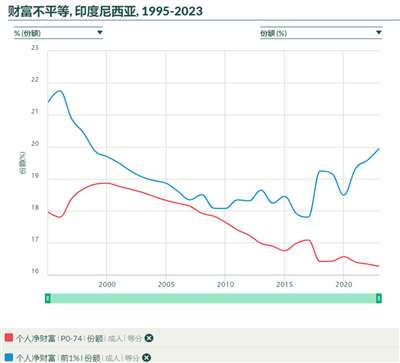 可以看到,占印尼人口1%顶级富豪人群财富之和超过了占印尼人口74%的劳动人民财富的总和。