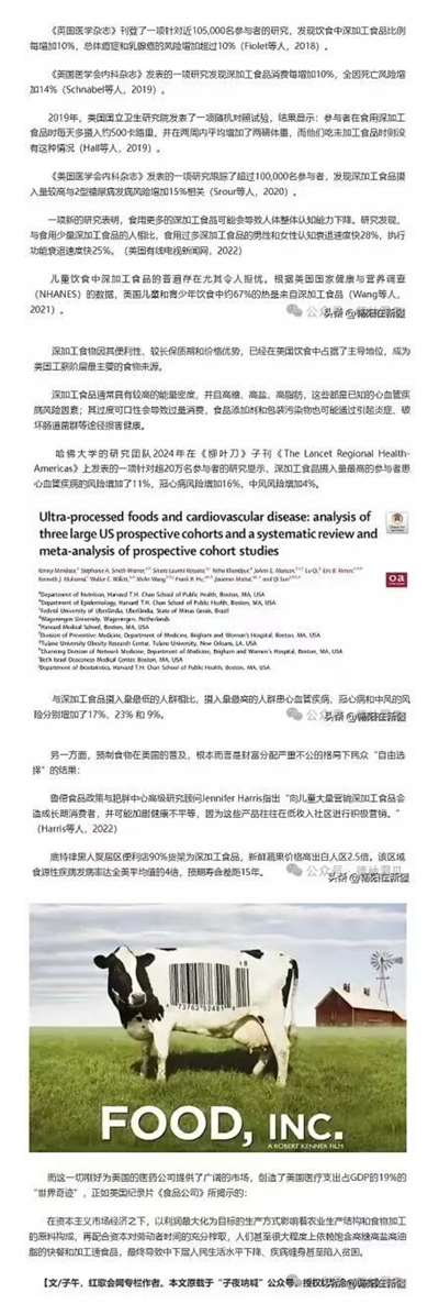 所以美国的食品加工业制造出含有食品添加剂、转基因的美式快餐及超市加工食品给予美国普通民众吃。并且美国食品业还对美国法律施加影响,不允许美国普通民众自己种植对自身健康有益的蔬菜。并与美国医疗产业合为一体,甚至就是由同一个美国生物资本来投资美国食品企业的。目的就是要以美式快餐及超市加工食品通过加工食品中的含有的食品添加剂来制造慢性疾病,以为其医疗产业提供更多的慢性病医疗客户。