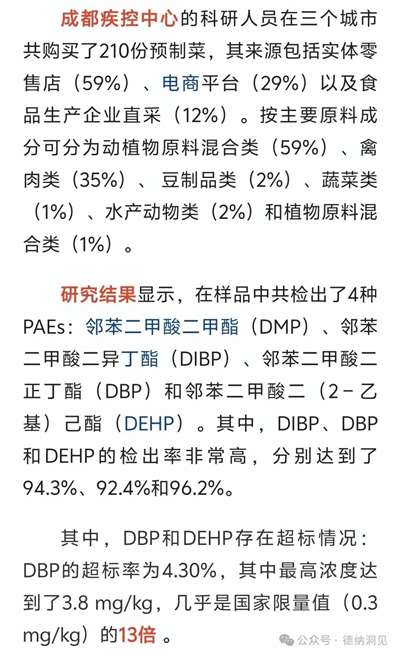 四川疾控,广州疾控分别发表在《食品安全质量检测学报》和《食品科学》的文章,目前这种不论是半成品,还是预制,还是预加工食品的包装袋中的邻苯二甲酸酯(塑化剂PAEs)会随着菜品的保存和加工特点而迁移到食物中,四川口味重,检出PAEs超标13倍,广州口味淡点,检出PAEs超标6倍。