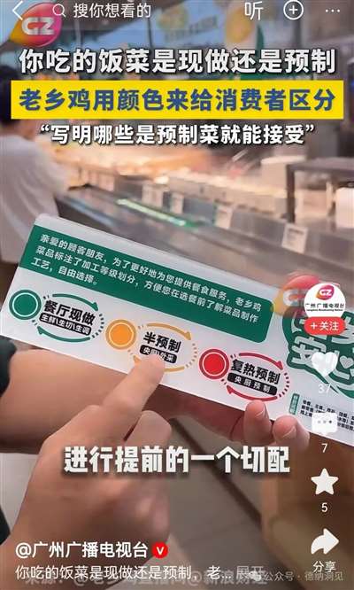 未来一是预制菜应该公开标识,好让消费者自己做选择。比如西贝可以在餐厅里像“老乡鸡”那样按现场明火炒菜、半预制菜(央厨外采)、复热预制菜(央厨预制)进行颜色标识分类,以让顾客自主选择: