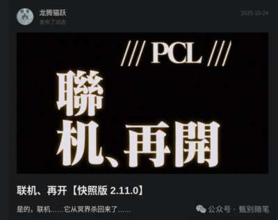 10月24日,开源免费的 Minecraft(我的世界)启动器 PCL,由开发者 龙腾猫跃 宣布重新上线联机功能。这条消息像一颗石子投进平静的湖面,玩家群体瞬间水花四溅——评论区欢呼声此起彼伏: