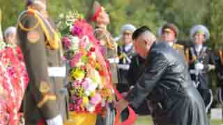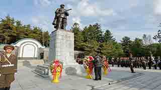 在中国人民志愿军抗美援朝出国作战75周年之际,朝鲜劳动党总书记、国务委员长金正恩10月24日参谒平安南道桧仓郡的中国人民志愿军烈士陵园,向烈士们表示崇高敬意。朝鲜人民军仪仗队在烈士陵园整齐列队。以金正恩名义和以朝鲜劳动党中央委员会、朝鲜民主主义人民共和国国务委员会名义敬献的花篮摆放在中国人民志愿军烈士塔前。金正恩肃立默哀,悼念中国人民志愿军烈士。随后,金正恩凭吊