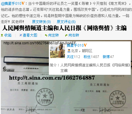 请注意,下面这位“人民网舆情频道主编和人民日报《网络舆情》主编”,如此吹捧南方系骨干西奴笑蜀。笑蜀是什么人呢?参见http://t.cn/hgPcvo所以我们一再说,别指望这些官府五毛了,体制早就被渗透的跟筛子一样了http://t.cn/hrqTUt